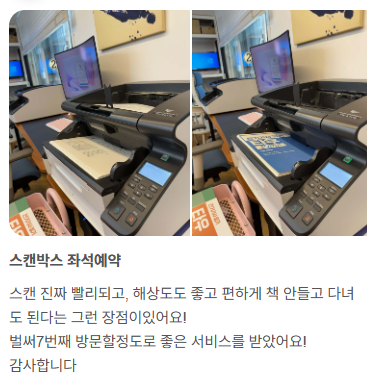 북스캔이 처음이라 걱정했는데, 직원분이 재단부터 스캔까지 모든 과정을 친절하게 안내드린 후 도와드린 후기들인데요.